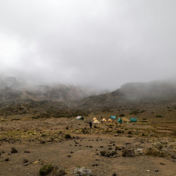 You gradually climb to Shira 1 Camp with wide views across the Shira Plateau and the western slopes of Kilimanjaro.
